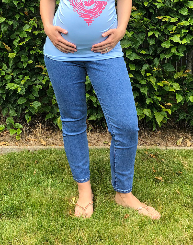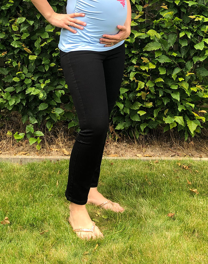 Als de band nog iets te los zit, kan je deze in het begin nog wat omplooien. Ook na de bevalling kan je deze broek misschien graag nog even doordragen, eventueel met omgeplooide band.
